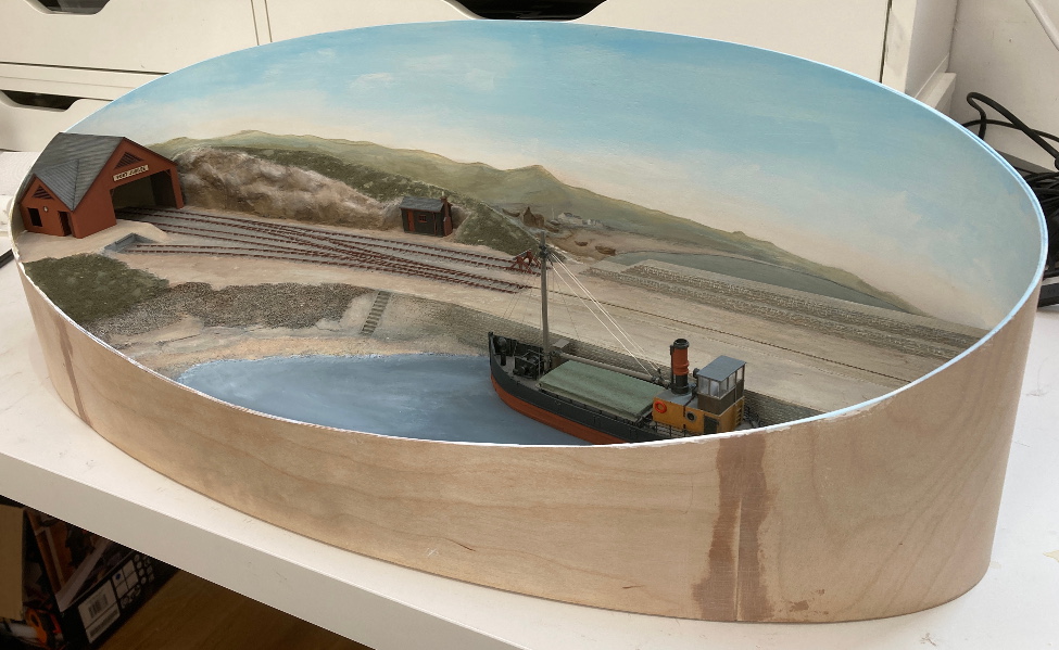 The classic Inglenook shunting puzzle track plan, with three sidings capable of holding 5, 3, and 3 wagons. The setting is rail served pier somewhere on the Scottish coast. It has an oval baseboard.