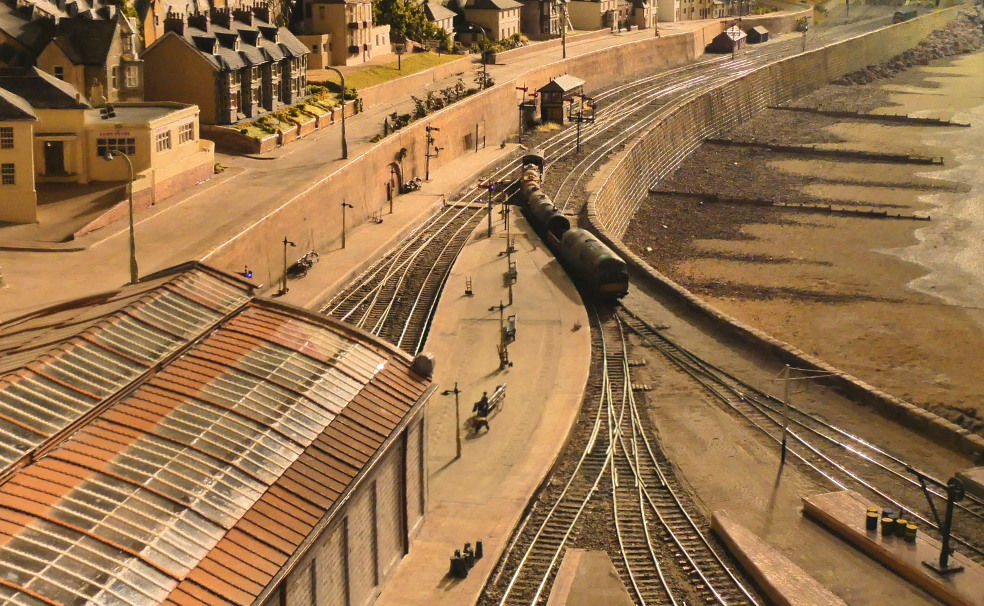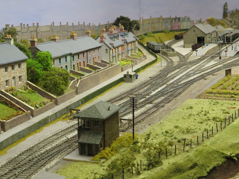 The buildings are scratchbuilt from card and are mostly models of the real things at Penzance, Room lights come on and go off as the day progresses into night and the 'sun' goes down. The trains that run during the hours of darkness are also lit. Our night scene is a popular feature - we regularly get asked 'how soon will it be dark?'