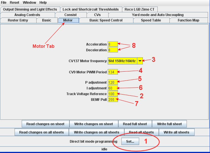 I begin the setup of a CT decoder by setting various parameters which control the motor. This can take quite a few iterations, so keeping notes of the changes made is a good idea. And, whilst one locomotive might give clues to another apparently similar loco, I find that the small mechanical differences between locomotives does alter the values which work best.