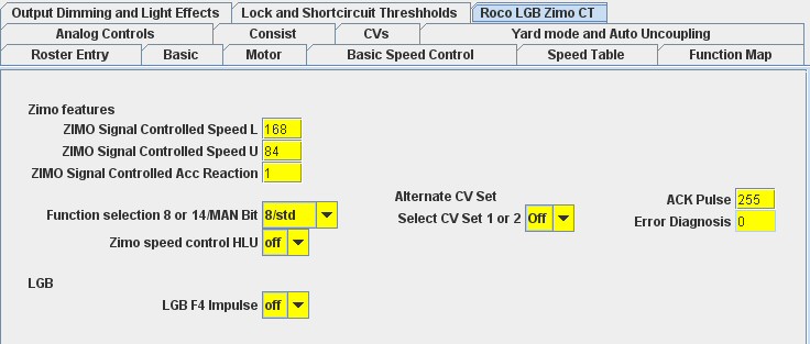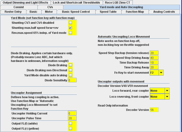 The CT chip has the ability to store two complete sets of CV values which the user can flip between with a single parameter. This might be useful to allow comparison of different settings, or to have a loco which is used in radically different environments. This is shown in the screenshot below, central column, or can be set manually in CV109, and takes values of 0 or 1 (to select either CV set). In practise, I suspect that setting up all the CV's to be almost identical twice is something which only users of software like JMRI will undertake.