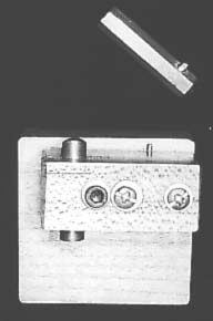 A nut is crushed into the clamping screw block to provide a thread for the clamping screw. The nut is deeply recessed into the block so that the emerging screw thread locks the depth stop bar. The block is shaped to clear the minidrill body and fixed to the rear of the headstock front bearing support with small wood screws. The position of the hole through the front bearing support is shown on figure 13.
