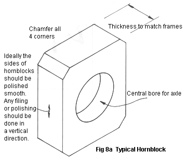 Figures 8a, 8b, 8c show a typical hornblock, and two axle bearing arrangements. The hornblock is simply a rectangle of brass, the same thickness as the frames, and drilled to fit onto the axle. The slot in the frames has to be only just wide enough to allow the hornblock to slide up and down freely within it, but with almost no lateral play. Note that in both figures 8b and 8c the washers at the ends of the muffs are of larger diameter than the width of the hornblocks. The hornblocks are thus trapped between the axle muff and the back of the wheel boss (figure 8c) or between the axle muff and the phosphor bronze spring wire (figure 8b) and hence hornblock guides are not required. A simple keeper plate along the underside of the chassis is required to prevent all the wheels from falling out of the frames every time the loco is lifted off the track.
