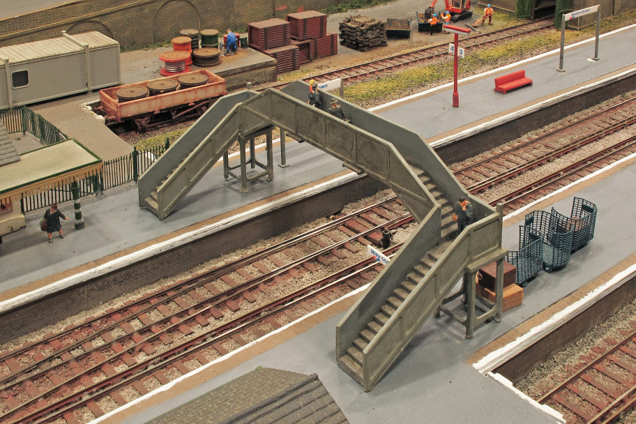 Footbridge - The original would have been a metal lattice type but, no doubt heavily corroded, has been replaced by a concrete sectional version, fabricated at the Southern Railway's Exmouth Junction works (or Ratio in this case!)