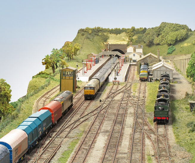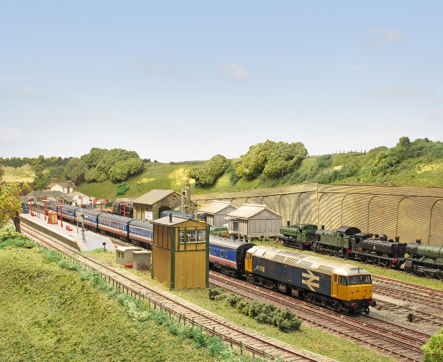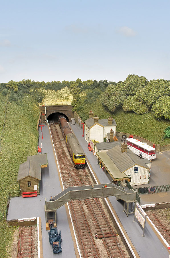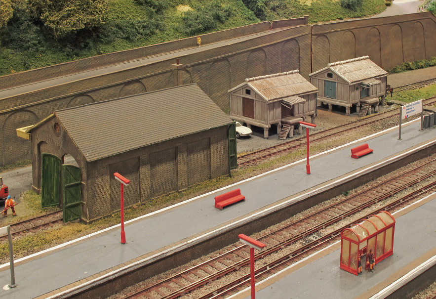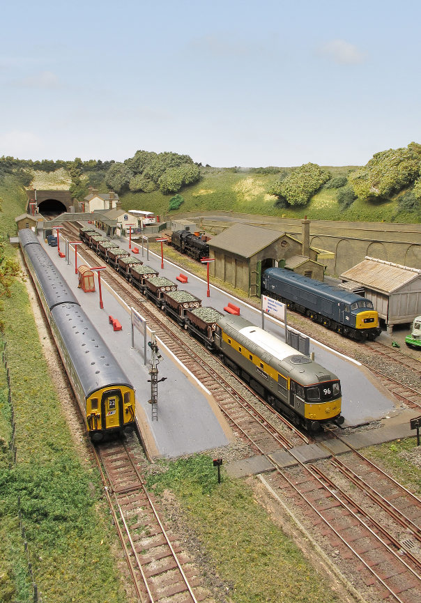 All trackwork, to 9.42mm gauge, is handbuilt, using rail and PCB sleepers and turnouts are operated by HM& solenoids. Most buildings have been scratchbuilt. The original 2 x 8 road fiddle yard has been replaced with a cassette system, to enable longer trains to be handled and to facilitate a quicker setting up and breaking down at exhibitions. At present, most of the locomotives and stock are Graham Farish and Dapol items, detailed and converted with finescale wheels, but a large programme of kit building is underway!