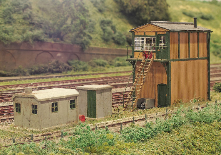 Signal box and PW huts - Scratchbuilt with a detailed interior. Note the signalman's bicycle resting against the privy!