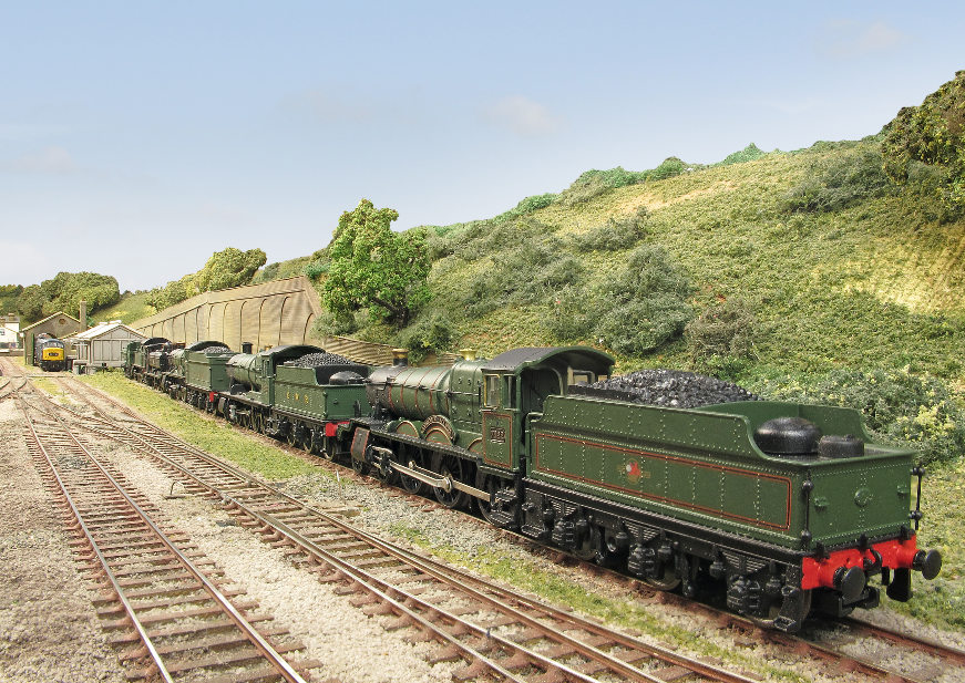 Former GWR 78xx "Foxcote Manor" leads a 38xx, a Hall, two Panniers and a 45xx in the restoration line. In reality, they are all unconverted N gauge locos so can't run on the layout yet!