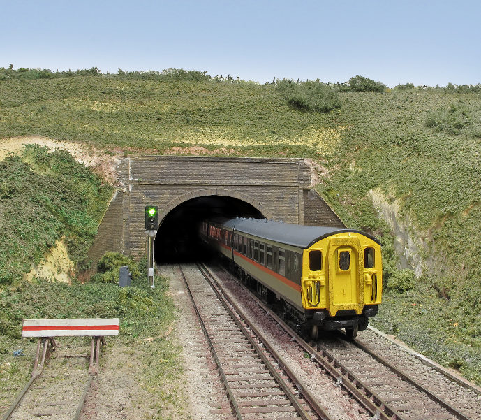 The "Jaffa-Cake" liveried 4-CEP leaves the tunnel on a down working. The new up advance starter colour light signal is shown to good effect.
